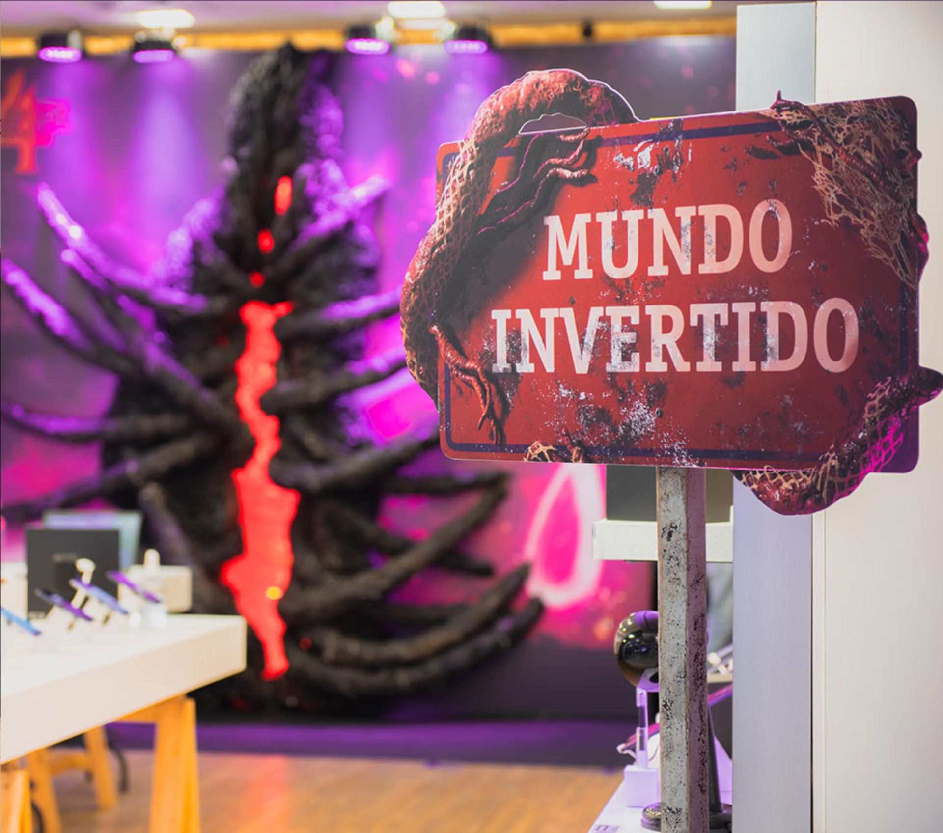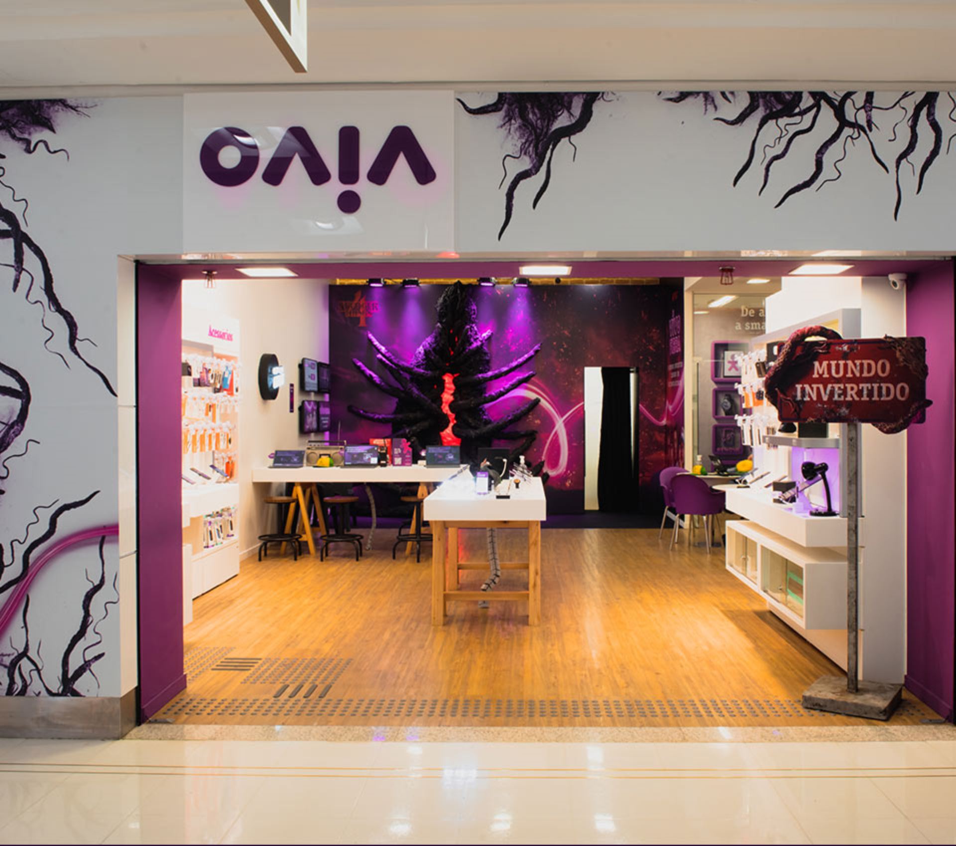 A conexão com o Mundo Invertido da série começava na entrada da loja com uma placa de boas-vindas à Hawkins e a aplicação do logo da Vivo de ponta cabeça.
